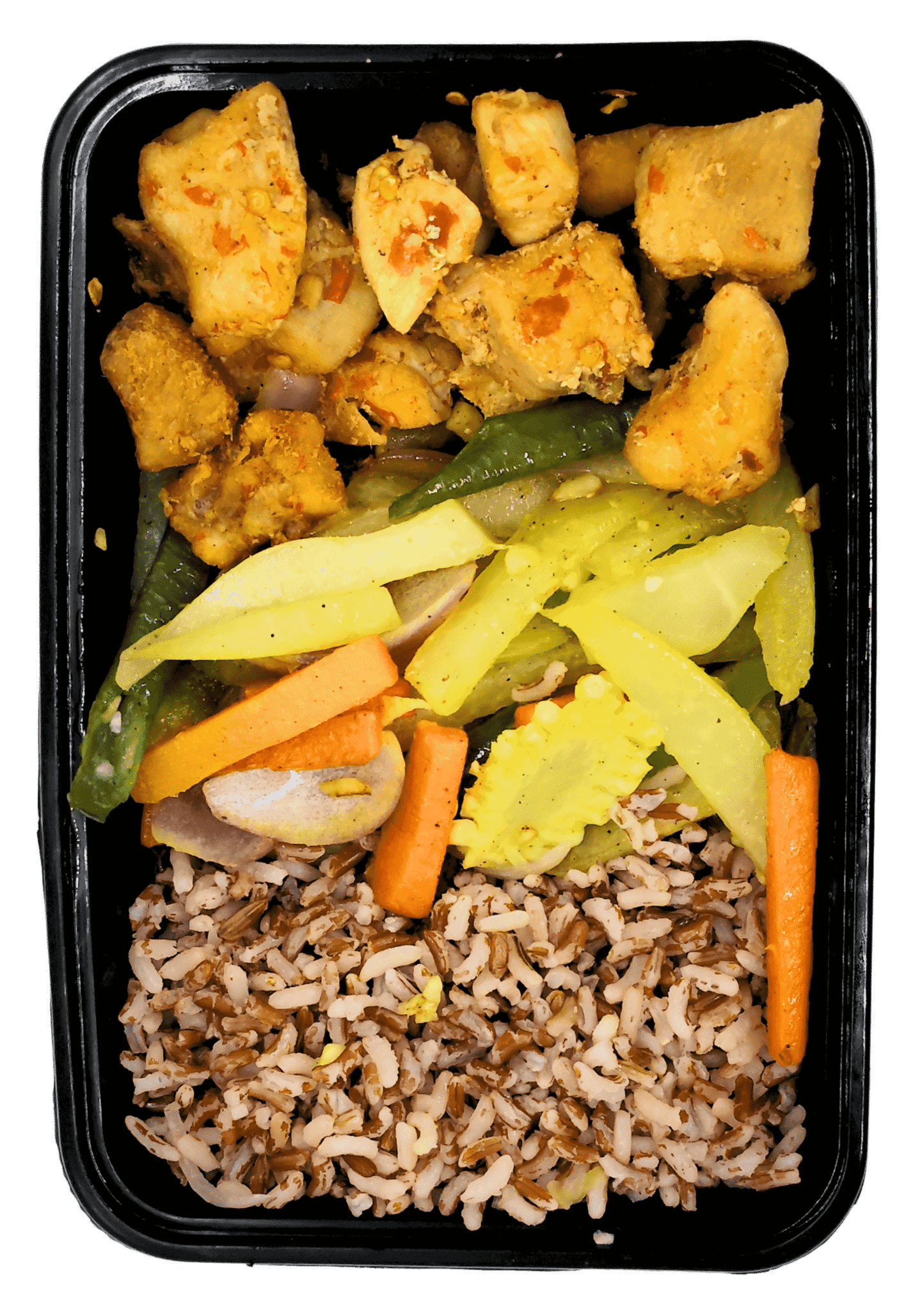 Prepared with Brown Rice (110g), Chicken - Sautéed with Butter(80g-Raw), Carrot(15g), Papaya(120g), Green Capsicum (10g), Long Bean(6g), Baby Corn(8g), Oregano(2g), Black Pepper(5g), Mustard Oil (3ml) & Required Salad Ingredients. – Total Net Weight - 320g. Ready to Eat
